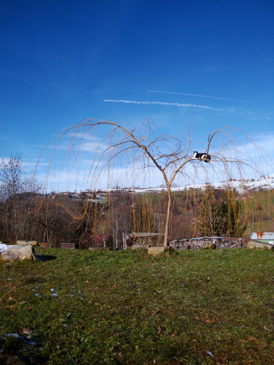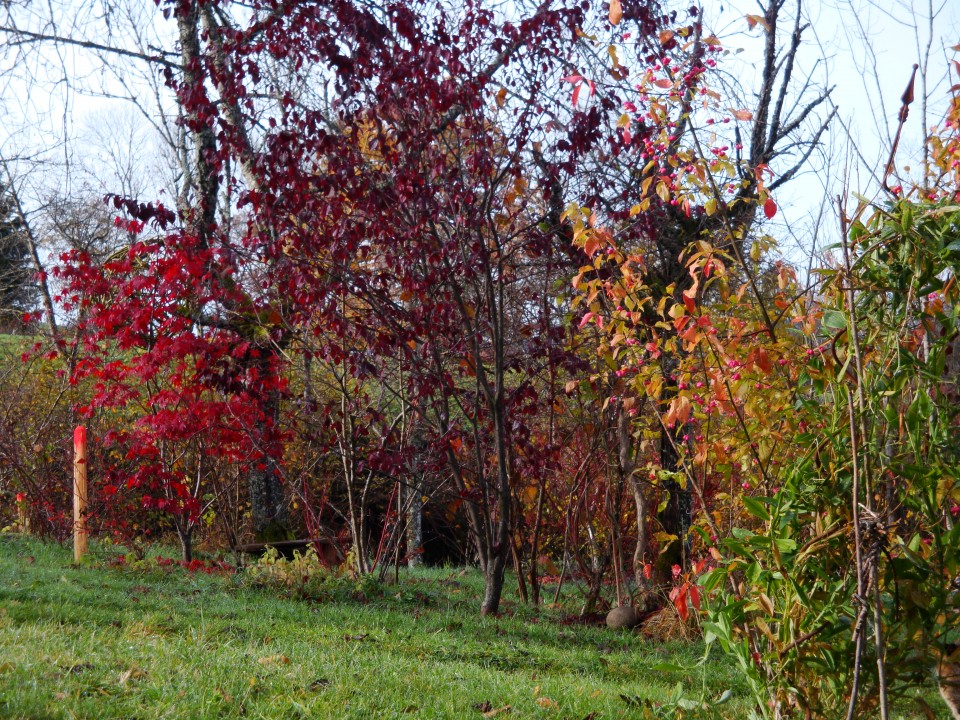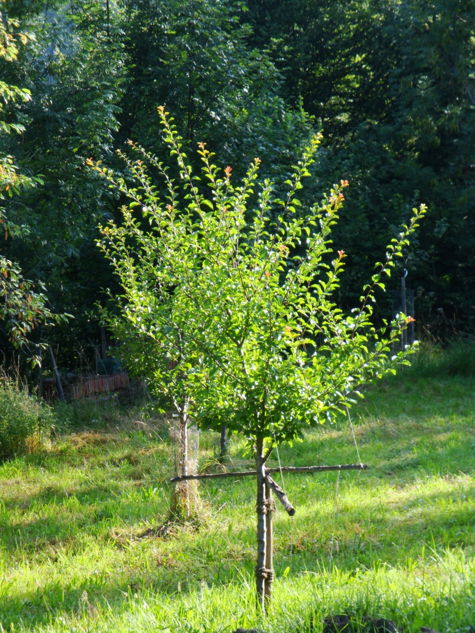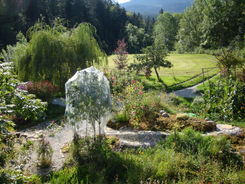 Am Fuss des Teichdamms wurden Korbweiden gesteckt. Diese werden als Kopfweiden erzogen. Die schon vorhandenen Obstbäume wurden durch weitere Sorten ergänzt. Sogar ein Nussbaum, und noch gewagter in dieser Hühenlage! Edelkastanien werden gepflanzt. Sie bekommen den geschütztesten, sonnigsten Platz - und fassen Fuss! Die ganz am Anfang gepflanzten Bäume haben sich schon mächtig entwickelt. Die Zwetschge liefert kiloweise Früchte, der Fächerahorn wird immer schöner. Aus einem der Äste der Trauerweide wird in Teichnähe eine Tochter-Trauerweide gesteckt, die ebenfalls Fuss fasst. Die Blutbuche entwickelt sich prächtig. Sie könnte eines Tages der Hausbaum werden, wenn sie überlebt und von den nachfolgeneden BewohnernInnen des Schwendli nicht gefällt wird.